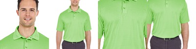 4.8 oz., 100% micro-textured polyester knit; Anti-bacterial; Anti-static; Moisture-wicking; UPF 30+ protection; Relaxed fit; Flat-knit collar; 3-button placket;